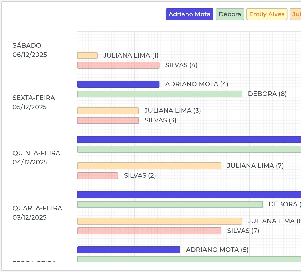 Por meio desta página, a supervisão acompanha as demandas diárias e pode redistribuir recursos para dias específicos, garantindo equilíbrio na carga de trabalho dos analistas e da frota.